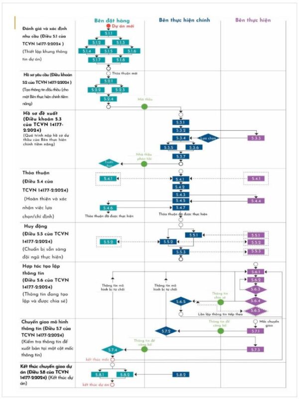 – Dự án có thể có nhiều thỏa thuận tương ứng với các bên thực hiện chính khác nhau, khái quát các bước có thể tham chiếu minh họa bảng 2 của tài liệu (ISO 19650 Guidance 2: Delivery phase (tài liệu hướng dẫn của UK)).